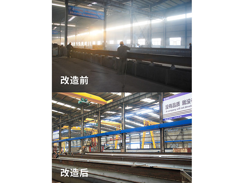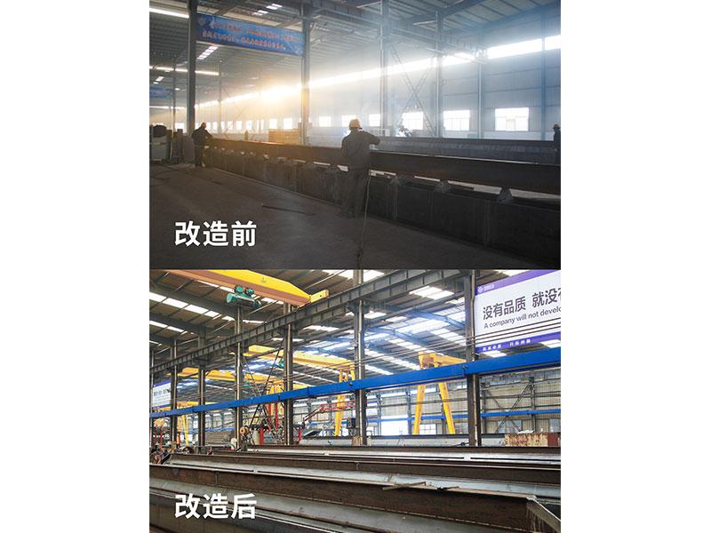 電動(dòng)單梁起重機(jī)主梁原來主要采用U型槽加筋板焊接工字鋼,然后焊接兩側(cè)板再聯(lián)接端梁的方式制作。該工藝缺點(diǎn)是U型槽生產(chǎn)效率低、勞動(dòng)強(qiáng)度大、焊接費(fèi)用高、焊接工序耗時(shí)較長(zhǎng),焊接變形量大,焊接過程產(chǎn)生較多電焊煙塵,污染嚴(yán)重,在進(jìn)行多段拼板、焊接、整形的過程中,焊接質(zhì)量難保證,時(shí)有主梁橫向焊縫產(chǎn)生裂紋缺痕。